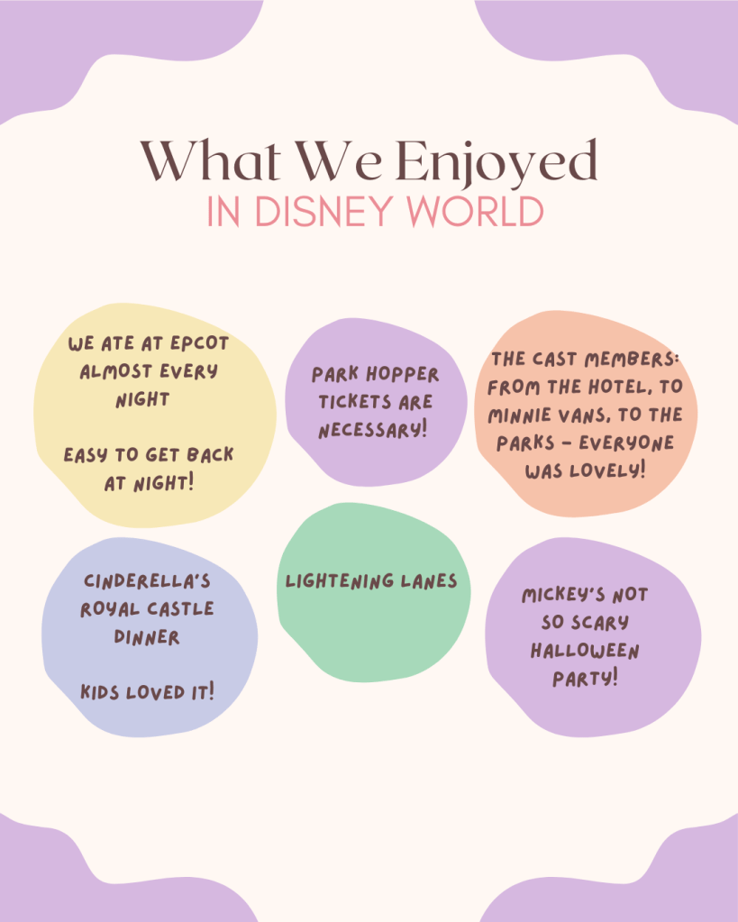 We finally did Disney World with our kids (plus both sets of grandparents)! My husband and I both have not been to Disney World in about 20 years, so we were basically visiting for the first time….in forever. I am going to preface with I am in no way an expert, or claim to be an expert on Disney World, I’m just sharing my experience as a rookie planner and what we really enjoyed. Ok, so, going into the planning, I was extremely overwhelmed. I didn’t know what the tiers of Lightening Lanes were or how to work it exactly, how riding rides was going to work within our schedule, if we should get tickets to Mickey’s Not So Scary Halloween Party, eating dinners at restaurants how do we do that whole thing – it was consuming any and all of my remaining brains cells.
